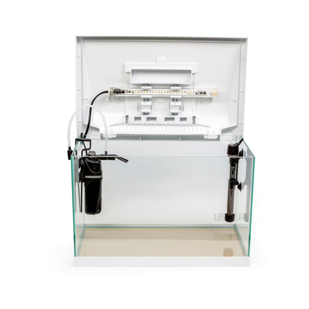 - Кришка акваріума оснащена запатентованою системою SMART OPEN, яка дозволяє зручно виконувати будь-які роботи з обслуговування всередині акваріума без необхідності підтримувати кришку. Велика заслінка дозволяє зручно годувати рибу, а спеціальні канавки в задній частині дозволяють вирізати отвори для установки будь-якого типу каністрового фільтра.