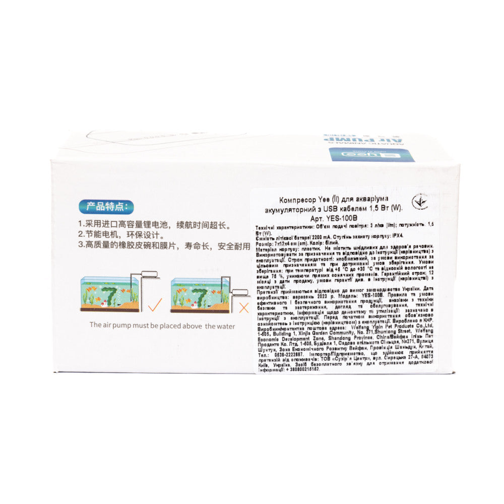 Компресор Yee для акваріума акумуляторний з USB кабелем, 1,5 Вт