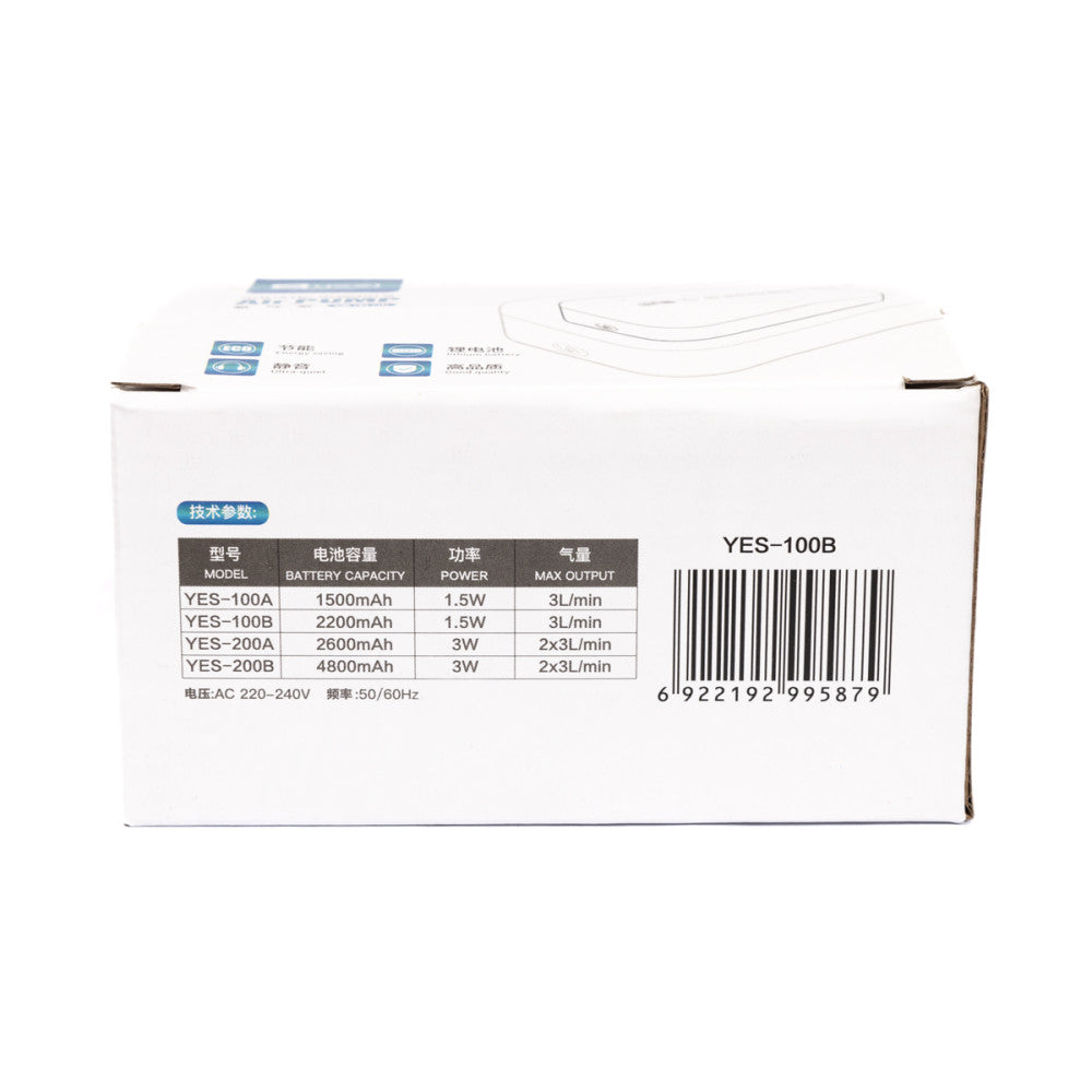 Безшумний акумуляторний компресор YEE з живленням від USB кабелю. Подвійний режим подачі кисню, безперервний (35 годин) та з перервами (70 годин). Може працювати під час зарядки. Система захисту живлення для запобігання перезарядки.