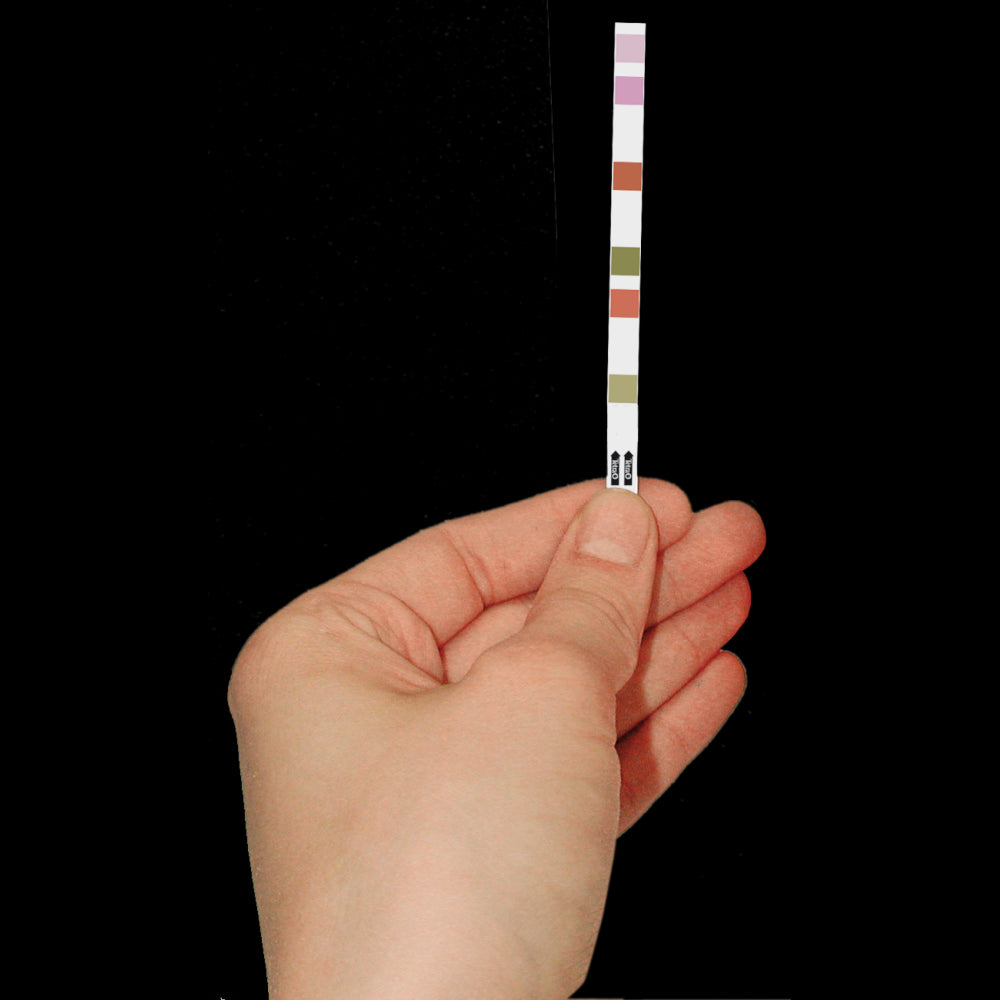 Застосування та дозування: обводьте тестовою смужкою у воді з боку на бік кілька разів. Струсіть надлишок води. Зачекайте приблизно 60 секунд та порівняйте тестові поля з таблицею кольорів.