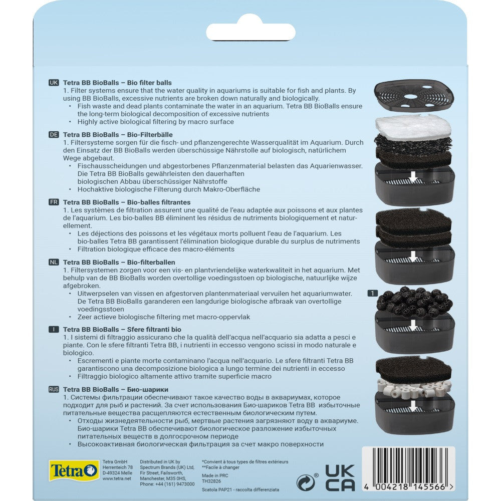 Оригінальний наповнювач фільтра Tetra «BioBalls» являє собою біо-кульки, які ефективно чистять воду, видаляючи з неї великі частки бруду. Вони охоплюють велику площу поверхні акваріума, що сприяє розмноженню потужної колонії бактерій нітрифікаторів, і біологічній фільтрації води