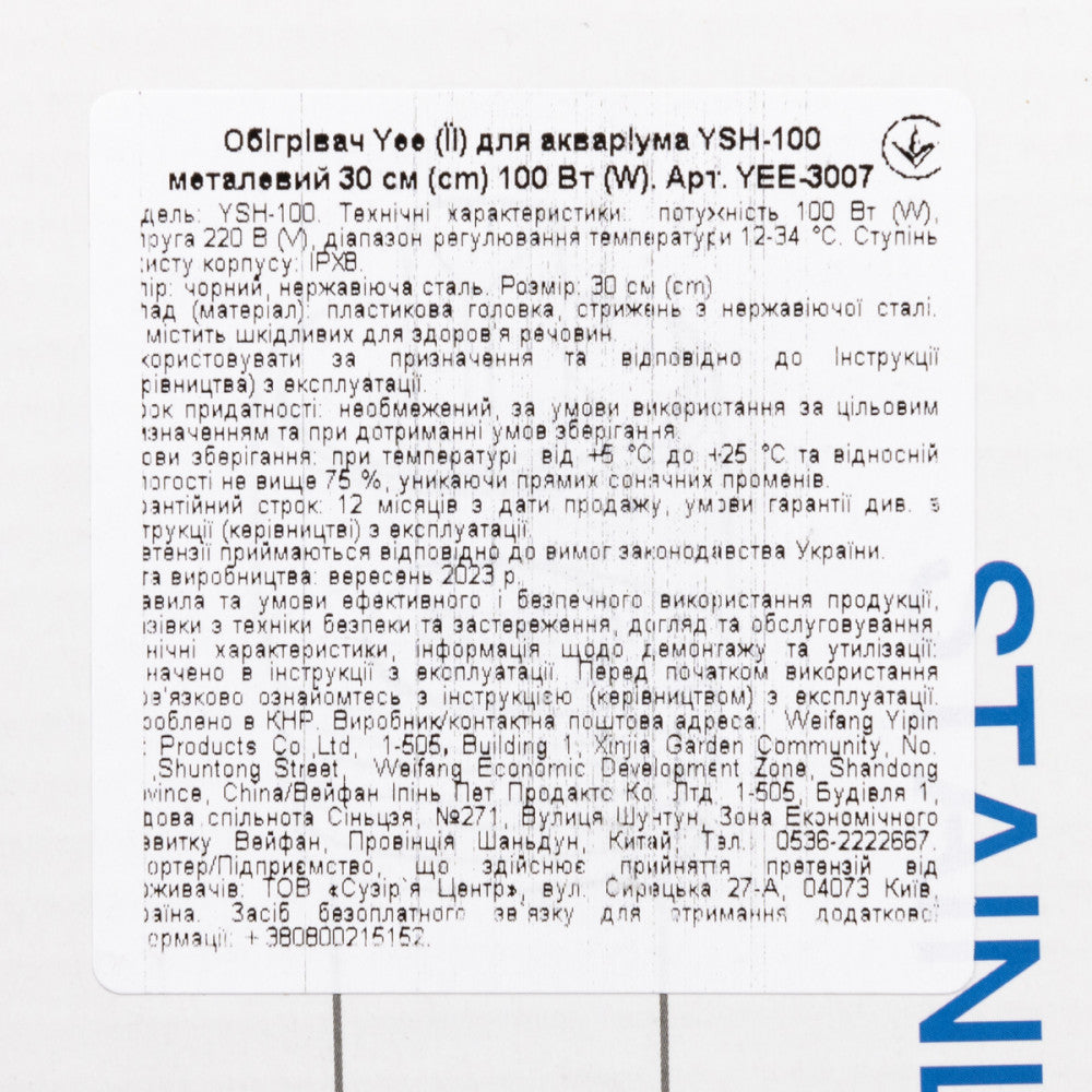 Обігрівач для акваріума Yee YSH-100 металевий 30 см, 100 Вт