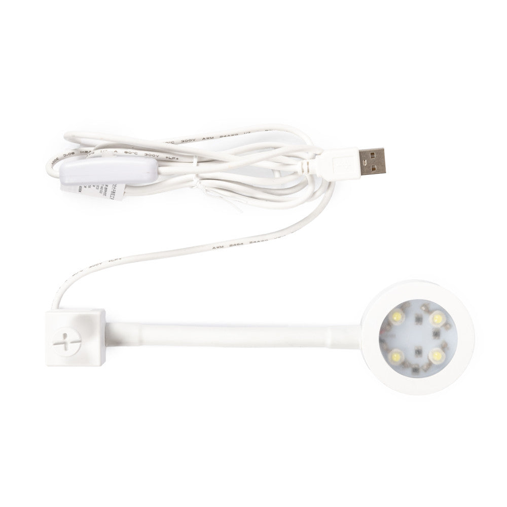 Завдяки спеціальному кріпленню світильник розміщується на верхній частині скла і фіксується затисними гвинтами. Модель з живлення від USB.