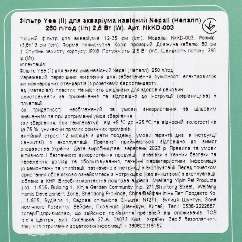 Фільтр для акваріума Yee Nepall навісний, 250 л/год, 2,5 Вт